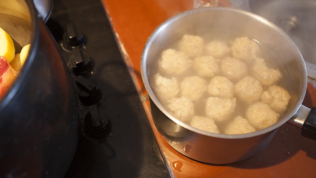 16 – small kneidlach (matzo meal dumplings) – with their cooking stock reserved