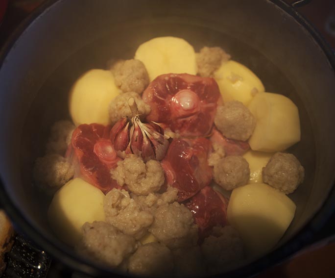 It also helps to have a wood burning stove such as I have here in Spain – perfect for slow cooking at low temperatures – but any real oven will do. Avoid however, electric slow cookers and dutch ovens (so sadly prevalent now in Israel) as you’ll end up with all the flavour escaping from the ingredients into the liquid: Fantastic if you want a brilliant soup, but not if you want a rich, unctuous hotpot where each component is packed with flavour.