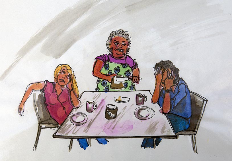 The breakfast turned out to be about as “Splendid” as the sleeping arrangements. As we took our table in the dingy breakfast room we were confronted with a pot of hot water, a jar of instant coffee and two slices of dry toast. When I asked the lady of the establishment – a stocky little woman with unkempt greasy grey hair, a cigarette stub apparently glued to her lower lip, and wearing a grease splattered pinny – if there was any butter, she grunted in the affirmative. Then, to my amazement and horror, she went over to the neighbouring table where an elderly man in a dressing-gown was eating his breakfast and took the piece of toast from his hand, picked up his knife and scraped all the butter she could from it. She then came back to us and spread his butter scrapings onto my toast…
