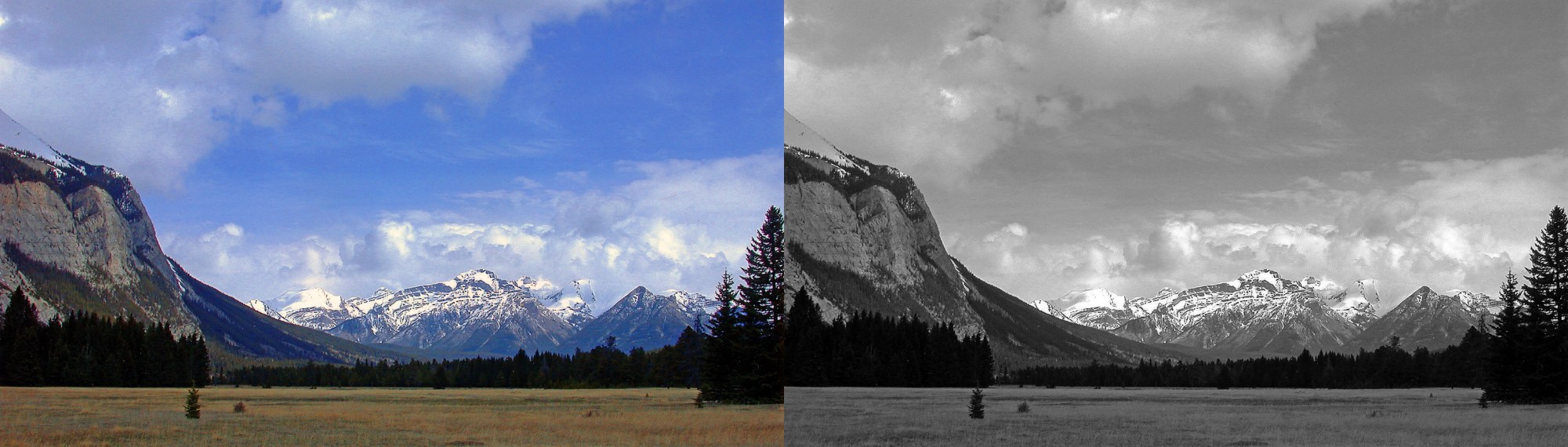 The photos here were taken on that first, crude Nikon digital camera, and remain to this day the closest I’ve ever got to emulating Ansell Adams himself – at least with subject matter (the scenery around Banff in the Canadian Rockies) if not in quality. They are presented in their original colour form, side-by-side with Photo-shopped monochrome twins. I upped the contrast to deepen the shadows and dramatise the tones in an attempt to give them a more “Adams feel”, and to see whether I would prefer them, or the original colour images. In the end, for me at least, there is no contest, and thus much to consider for my future landscape photography…