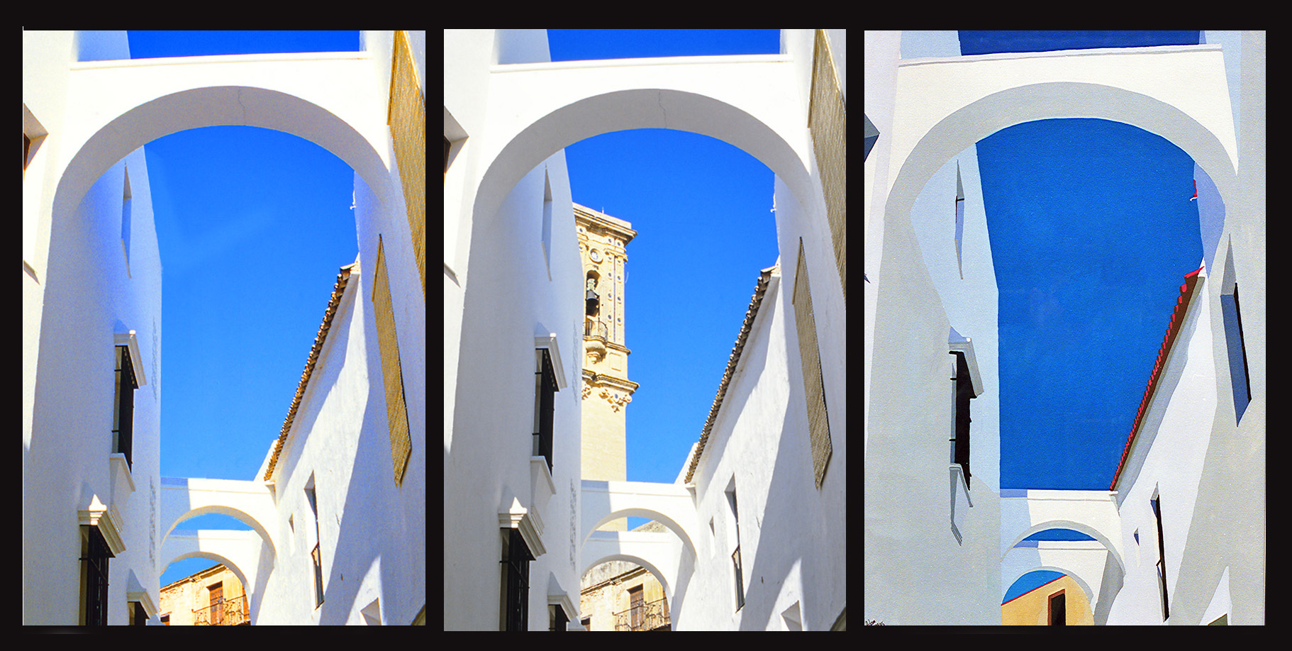 In every case excepting the “balcon” at Arcos I prefer the original gouaches, particularly the restaurant in Granada and the arch in Arcos de la Frontera. There are many reasons but the bottom line is just a matter of taste.