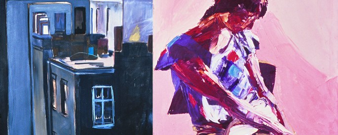 Girl Fastening Sandal was painted in 1988 and is evidently, everything the Soho picture is not. By this time I was confident and comfortable with both the oil paint and the painting surface and, more crucially, unencumbered by being part of any “art scene” – I didn’t have to worry about peers and rivals watching me over my shoulder. Whereas, with the Soho painting it was all I could do to produce any kind of image on the canvas, with the Girl painting I was preoccupied with expressing the joys and thrills of both the subject and the paint itself. It should look almost as if the paint flowed directly from my mind to the palette knife; a visual stream of consciousness; like a happy, joyous thought. The two paintings here graphically represent a pretty dramatic 10-year transition from student to artist and from teenage hesitancy to adult assuredness.