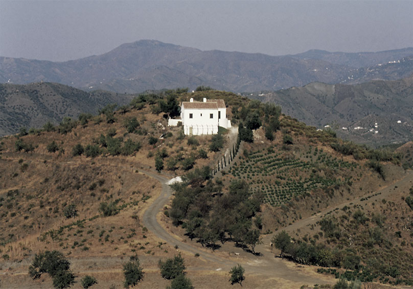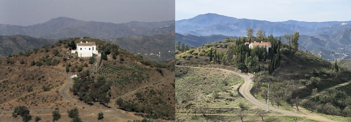 The house and finca in the summer of 1995, two years after our move to the Axarquia region of Andalusia, and 18 months after completion of the house. Some of our new trees can just be made out, such as the young cypresses lining the edge the drive. At this point, the farm comprised primarily the existing north vineyard (to the lower right of the house) and almond trees. We relied totally on solar energy and rain water, collected in a large tank constructed beneath the house……and this is virtually the identical scene taken this Boxing Day in the winter of 2019. The north vineyard is still there, and some of the almond trees, plus the cypresses are now 25 years older – and taller. However, in 2004 we were finally attached to mains electricity (and the Internet) allowing us to set up a remote control irrigation system and thus plant orchards (mostly olive, citrus and avocado) and a garden of sorts, and to surround ourselves with tall trees.
