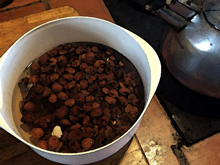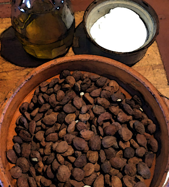 But undoubtedly the simplest of all our regular almond recipes, is also the most moreish and is equally good made with fresh or dried almonds. It even works quite well with the sort of (mostly American – heavily irrigated) almonds one has knocking about in plastic packets in British, European and American kitchen store cupboards. The only thing I would suggest doing differently from my recipe below, is to use a cheap, refined olive oil, rather than the first cold press oil I use. Unless one has a Spanish finca like ours, with our own olives and copious amounts of the finest oil, or is extremely wealthy, the taste benefit of using extra virgin oil over refined olive oil is minimal.