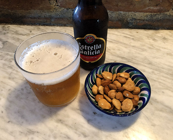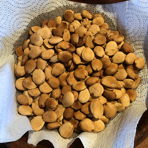 Of course, just about everyone around here, with a finca, like us, or just a small patio garden, has at least one almond tree, so that in addition to the ubiquitous sack of stored almonds in the pantry, or the bodega, there’s generally a proliferation of the fresh fruits from mid-July until the end of August. Whereas the older nuts will typically be used for such winter staples as Almond Chicken and Albondigas (meatballs) in Almond Sauce, in summer, the fresh, softer fruits, will be blended with stale bread, garlic, olive oil and spring water to produce, rich-yet refreshing ajo-blanco – garnished with halved moscatel grapes, perhaps the greatest of all chilled soups (commercial “almond milk” – eat your heart out!).