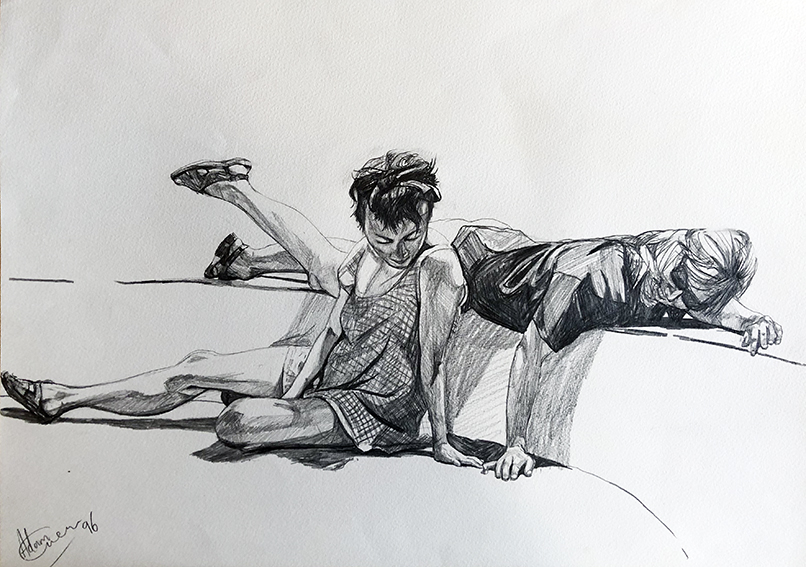 Unlike line drawing sketches, these take account of light and shade as much as form, giving them a more obvious dramatic content. But, as with line sketching, often, what is left undrawn, is as important to the feel of the picture as what is drawn. In the case of these works, it was my intention that the whiteness of the untouched paper in contrast to the painstakingly executed figures, and the shadows they contain and cast, would accentuate the feeling of the harsh Spanish sun, saturating the tender friendship of the two girls.