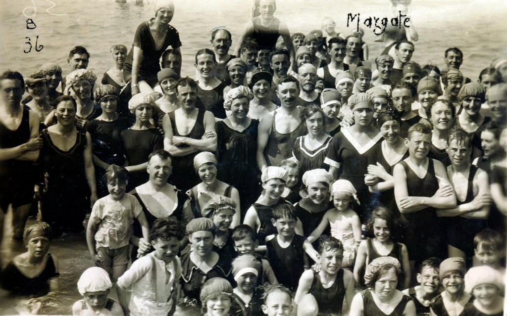 The East End of London – circa 1927 – A group of dapper young men , attending a wedding. The diversity of the group is unusual for the time and not a little heartening. The extremely serious looking chap, second from the left is my grandfather, Harry Pizan. His contribution to this particular ethnic melting pot was his recent Galitsiye (Galician) ancestry; he himself having arrived in London from what was then known as Polish Austria (today’s southern Poland) as a two or three-year-old toddler about the turn of the century.As the scrawls inform us, Margate – August, 1936 – and a large group of bathers, including my grandmother Becky, and her sister Ray; the two shower-capped ladies, arm in arm, toward the top left of the crowd. For those Americans (and others) unfamiliar with Margate of the 1930’s, perhaps think Coney Island?