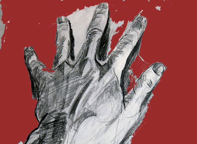 As he started wiping and rinsing around the wall, diluted blood and water seeped from the sponge and ran through his fingers and down his wrist and forearm.
