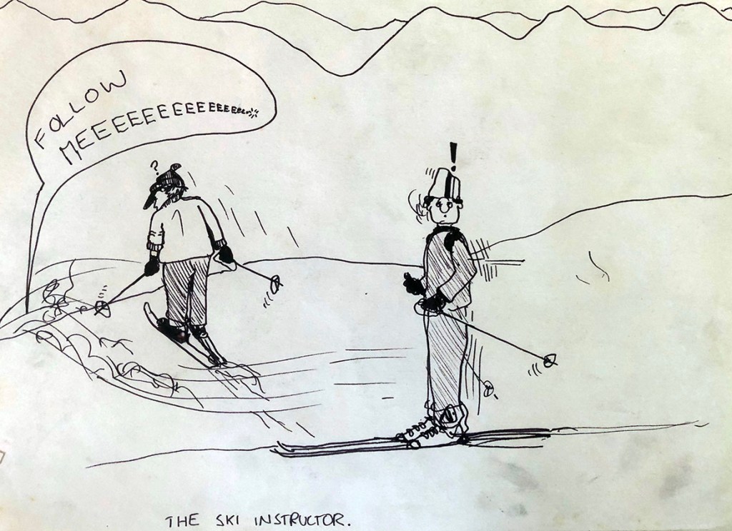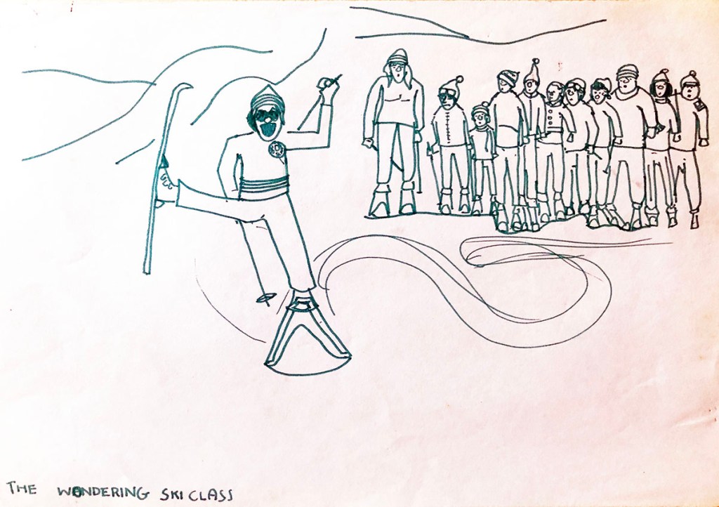 However, as my seemingly never-ending trawl through my old artwork continues, I’ve recently rediscovered a pile of cartoons I did as a 12 and 13-year-old boy, on one or two of my very earliest ski-trips, and which brought amusing winter memories flooding back…