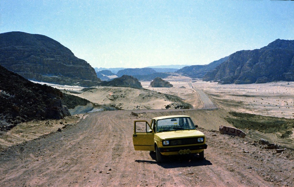 In 1978, my oldest friend Simon and I spent the summer as volunteers on a kibbutz in northern Israel. Although our labour was voluntary we were paid a weekly amount to cover basic needs such as cigarettes, booze and staples from the kibbutz general store. Fortunately, we didn’t smoke; the beer was cheap, and we were sufficiently content with the food produced in the members’ dining room that we’d spent relatively little, and by the end of the stay had a reasonable amount of money saved up. We decided to pool our savings with another couple of English guys, Tim and Ben, hire the cheapest car available (which happened to be a typical 70’s yellow Fiat 127) and drive down south to spend a week in the Sinai Desert.