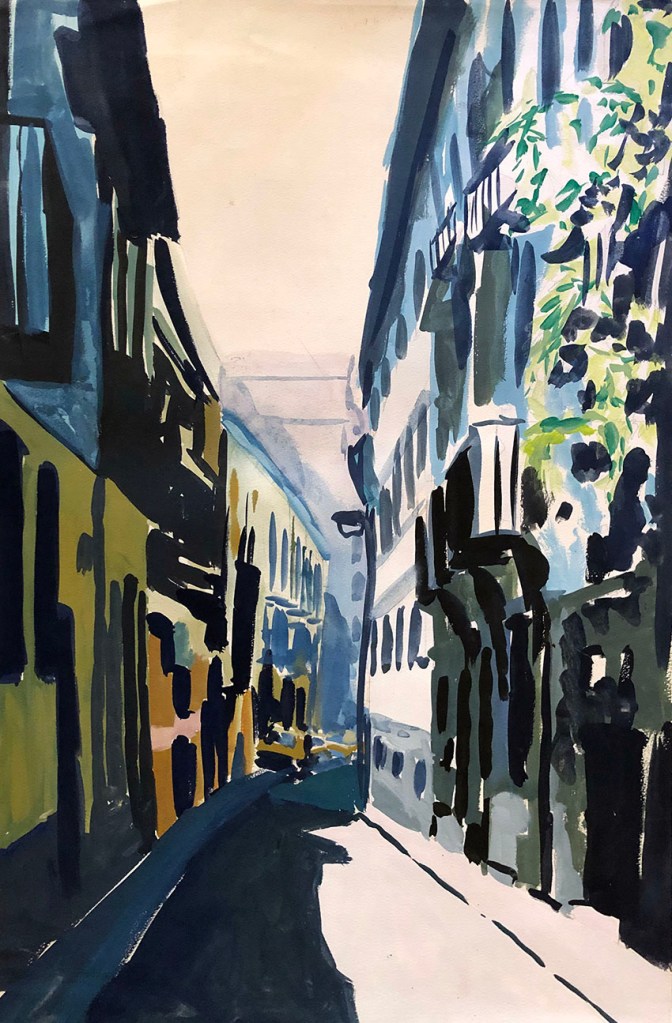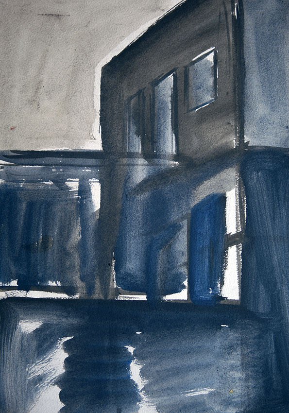 The half-dozen gouache washes here cover the end of my time at Harrow and my early days in Soho, with a visit to Spain in-between. They reveal my dabbling with a gentle form of constructivism, which was in reality a mostly contextual necessity, given the locations of my subject material. In any event, as with most of my work, in all its forms, they are ultimately all about the light – light that can lend drama and even a little beauty to most brutalist of concrete structures. There’s a deep message in there somewhere, but that’s another story…