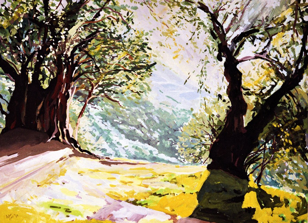 Jerusalem Pines near Jerusalem – 1987 (84 x 59cm / 33 x 23″). Another tree-themed picture, derived from the only trip abroad I devoted entirely to painting. Together with my friend from Saint Martin’s, Danny Gibson, we spent three weeks walking and sketching in the hills west of Jerusalem above the picturesque village of Ein Kerem. The reams of sketches I did there (mostly in coloured pen and ink) provided me with excellent source material for years to come.