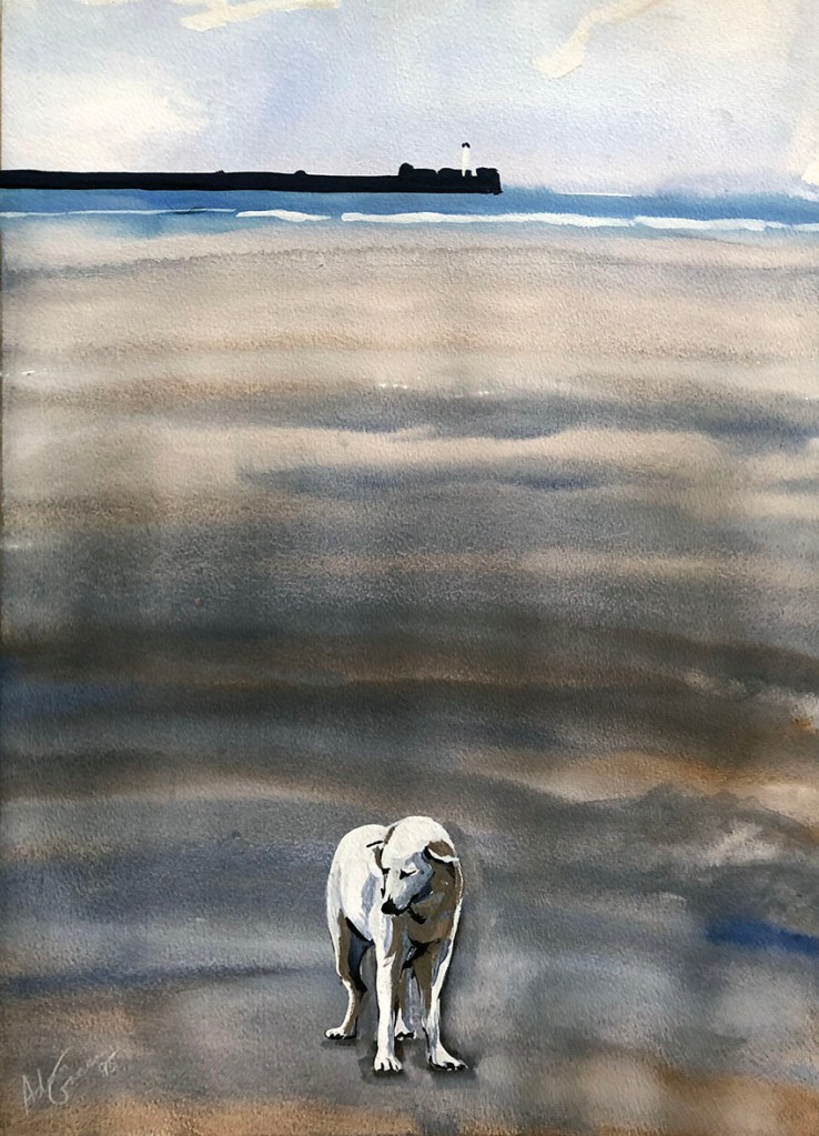 Aura on Boulogne Beach – 1995 (84 x 59cm / 33 x 23″). The most watercolour-like of the painting presented here, a sponged wash. However, the subsequent contrast in texture of the dog (our late beloved Maremma Sheepdog, Aura), in thickly applied Titanium white would be harder to achieve in pure watercolour. This picture dates from a later period than the others, when I had moved into commercial art. This was a spur of the moment (note the rippled, unstretched paper), somewhat emotional testament to our miserable , enforced sojourn in Boulogne-Sur-Mer.