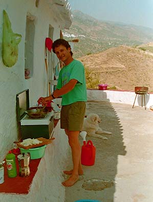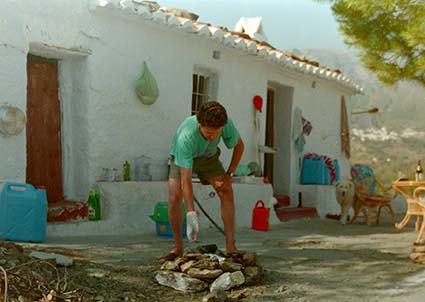 Our second visit to Finca Camilla – as it was then – in the winter of 1992. We were accompanied by an architect friend from Seattle and he convinced us to buy the place…This was our first full day in our new home. We’d just done a massive shop for basic supplies in a supermarket in our local town and you can see much of it here…Our bedroom for the next few months – the main room of the old cottage. Basic, but snug…Aura was a large dog who enjoyed snuggling into small spaces and cuddling up with us. She isn’t really on Dido’s head…Our trusty bucket shower – three minutes of sun-warmed bliss. Only trouble was that across the gorge, in our local village the Guardia Civil had a pair of high-power binoculars trained on Dido every time she showered. She was soon known as the “la rubia ducha”. After that we showered indoors…I made this oven from stones. One of the first things I cooked in it was chicken stuffed with peaches. It was out of this world but I’ve never been able to replicate it in any other oven…Our “deluxe” camping stove. This was the first time I used it . I had no idea that I would still be using it almost a year later…Good food, good wine, good music, and a view to die for (oh, and a good woman – taking the photo). Life was good…Our “lounge”…Almond whacking – the finca included over a hundred almond trees. Took two months to pick, hull (remove the outer skins), sort and sack up all the fruit……then we’d take the fruit down to the local factory where we were paid the princely sum of £60 for over 500 kilos of fruit…We couldn’t believe the sheer volume of almond skins. Ultimately we dug a trench for them…Some of our first summer’s harvest – small cherry figs, moscatel grape and almonds…Dido and Aura sitting at the back of the cottage looking at the stupendous views to the north and west…Our local white village (or pueblo blanco), Canillas de Aceituno – famous for producing the King’s favourite olive oil…Our neighbour Curro ploughing our land with his mule…Aura doing her thing – guarding the Greens. A few years later after she died, we memorialized her on our wine label as “La Guardia Blanca”